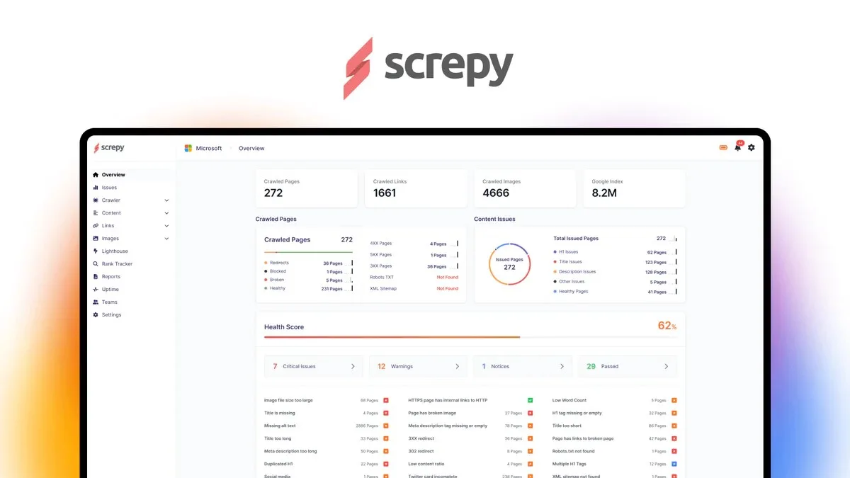 Screpy is an all-in-one SEO monitoring platform solving the dashboard fragmentation nightmare where site managers subscribe to separate tools for every SEO function—keyword tracking, technical audits, uptime monitoring, page speed analysis, competitor research—then spend 6-8 hours weekly logging into five different platforms, exporting data into spreadsheets, and cross-referencing metrics that contradict each other because each tool measures differently, updates on different schedules, and defines success metrics inconsistently. Most SEO teams receive ranking drop alerts 3 days after problems start because keyword trackers update only twice weekly, discover their sites went down for hours costing sales because uptime monitors check hourly missing outages between monitoring intervals, hit keyword volume limits forcing expensive upgrades when tracking hundreds of keywords across multiple sites, manually copy data from separate dashboards into reports taking 4 hours to compile, and waste entire days fixing 200+ flagged issues without knowing which 20 actually impact rankings versus cosmetic problems that don’t move needles. Screpy fixes this by providing unified dashboard combining keyword rank tracking across unlimited keywords for desktop and mobile, technical SEO audits scanning sites identifying broken links, missing meta tags, slow pages, and mobile issues with actual severity ratings, uptime monitoring checking site availability with customizable frequency intervals sending instant alerts when sites go down, Core Web Vitals tracking monitoring performance metrics that directly affect rankings, competitor analysis tracking how competitors rank for your keywords, AI-powered task prioritization automatically ranking detected issues by actual ranking impact showing which fixes matter versus busywork, Google Search Console integration importing clicks, impressions, CTR, and position data directly into the dashboard, and AI content writer generating SEO-optimized articles targeting discovered keyword opportunities. Agencies managing 25+ client websites tired of maintaining 125+ separate tool logins just to check daily metrics, affiliate bloggers tracking hundreds of keywords hitting volume caps on traditional tools, and e-commerce stores that lost thousands during overnight downtime because hourly checks missed outages between monitoring intervals use Screpy to consolidate monitoring and catch issues before they cost revenue.