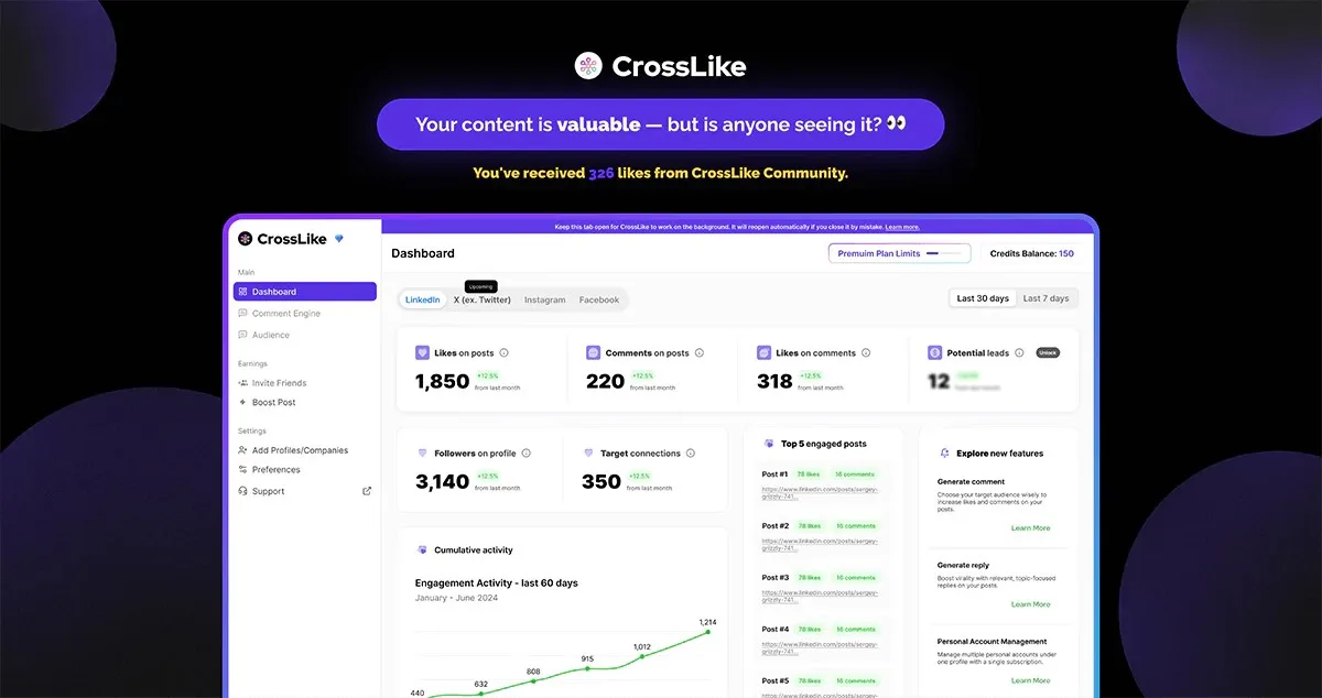 CrossLike is an AI-powered LinkedIn engagement automation platform that helps marketers, founders, and personal brands increase post visibility and virality through authentic-looking engagement signals. It provides likes, thoughtful AI-generated comments, comment replies, likes on comments, bookmarks, and private DM shares from real professional accounts (founders, C-levels, influencers) to trigger LinkedIn’s algorithm favorably, follows a unique multi-phase engagement strategy that mimics human-like interaction patterns while staying within LinkedIn guidelines, offers a Chrome extension with secure API connections (no password sharing), includes multi-profile management dashboard with real-time analytics tracking impressions and engagement rates, and provides comment engine that automatically engages with posts from selected influencers using your distinct tone. SMM managers, LinkedIn personal brand managers, founders, CEOs, and marketing teams use CrossLike to scale their LinkedIn presence, go viral more consistently, and manage engagement across multiple profiles from one platform.